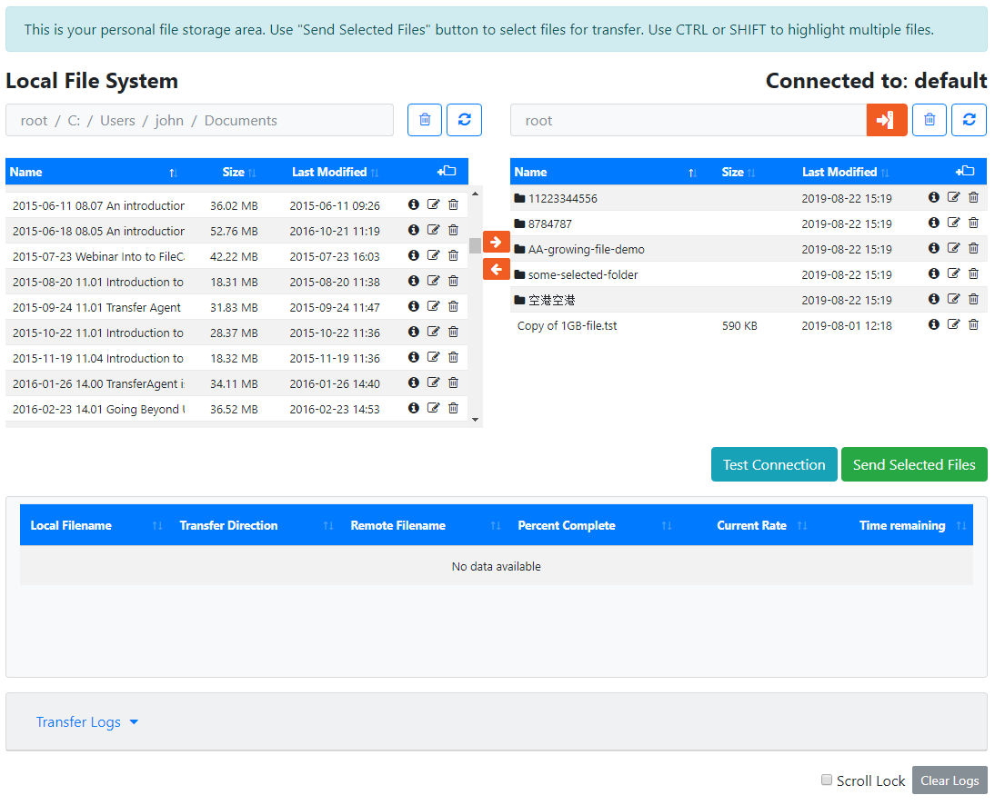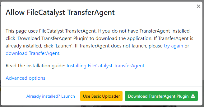 This page requires FileCatalyst Transfer Agent. The first time you visit this page, you will be prompted to download and launch (or start) Transfer Agent.